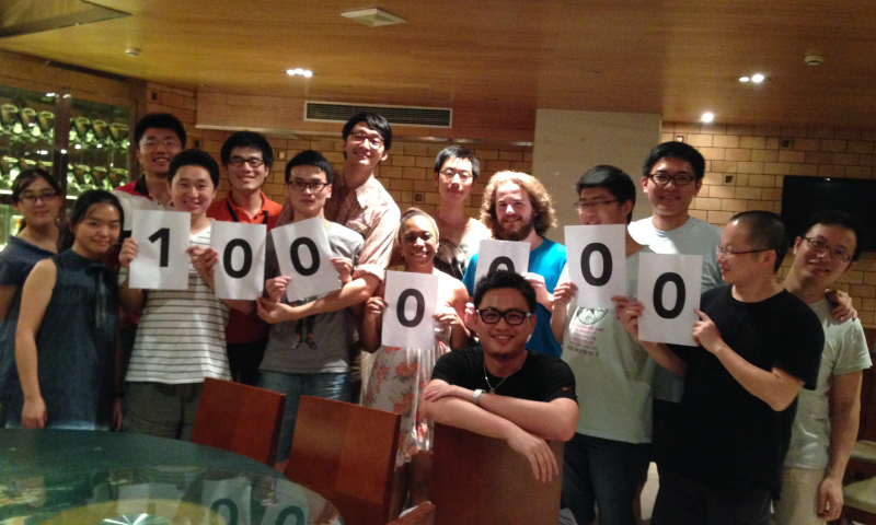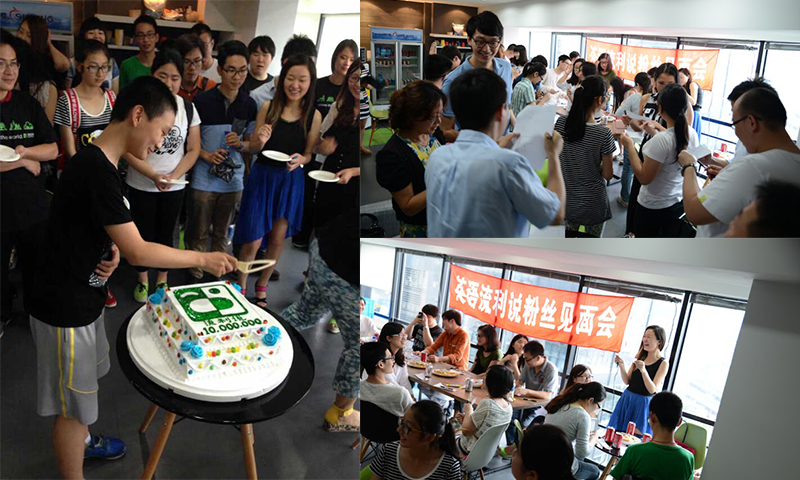 2014年 6月,用户在流利说®上海办公室切蛋糕庆祝1000万用户达成。